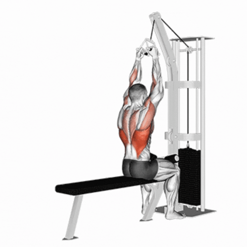 수직 당기기 동작으로 팔의 신전을 통해 광배근 자극에 집중한다. 특히 그립을 좁게 잡으면 수직 궤적의 비중을 높여 중하부 광배근에 더 집중할 수 있다. 마지막 드롭세트에서 중량을 20~30%, 또는 5~10kg씩 낮추면서 근육을 끝까지 소모한다.