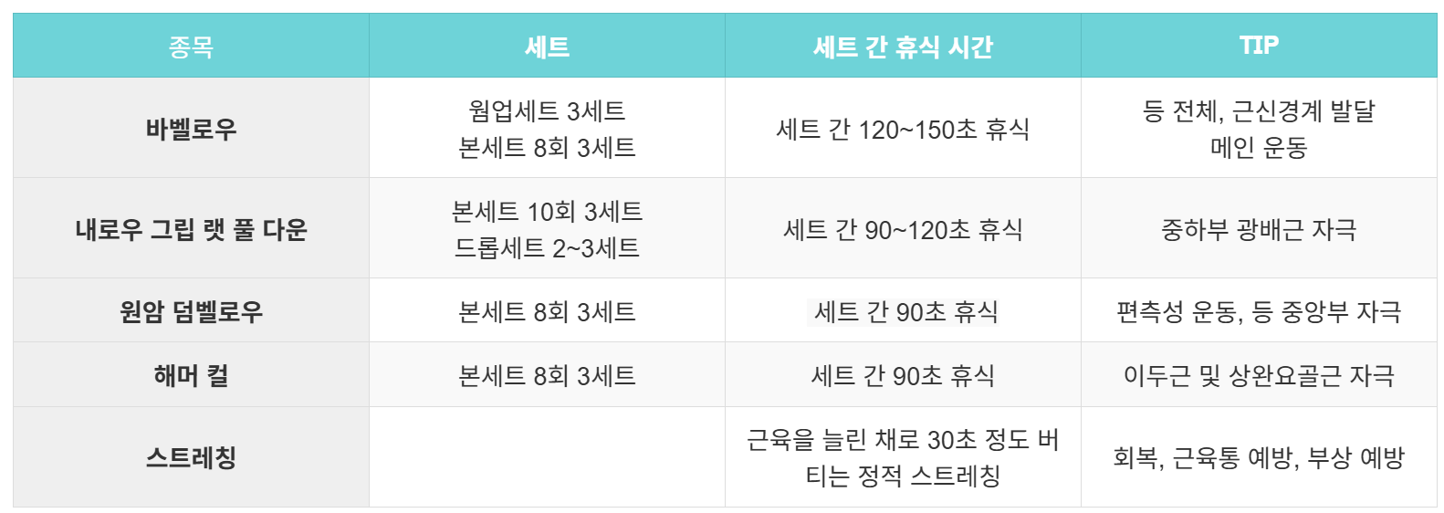 많은 중량을 다루는 만큼 세트 간 휴식시간은 120~150초 정도로 길게 잡는 게 좋다.
